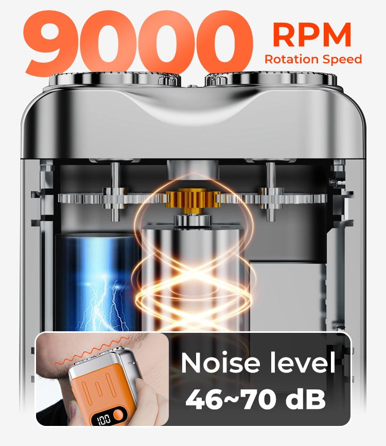 Experience exceptional performance with the 8X Power-Boost Mini Rotary Shaver, featuring a powerful 9000 RPM rotation speed that easily tackles tough, hard stubble. Designed for efficiency and comfort, it operates at a low noise level of 46~70 dB, ensuring a smooth and quiet shaving experience. Perfect for achieving a professional shave at home or on the go!